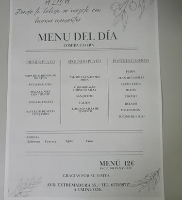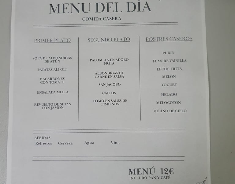 Tenemos menús de lunes a viernes por tan solo 12 euros. Incluye primer plato, segundo, pan ,bebida, postre y café. Pide tu menú para llevar, llama al +34 657 85 97 17 o al +34 667 81 90 80.